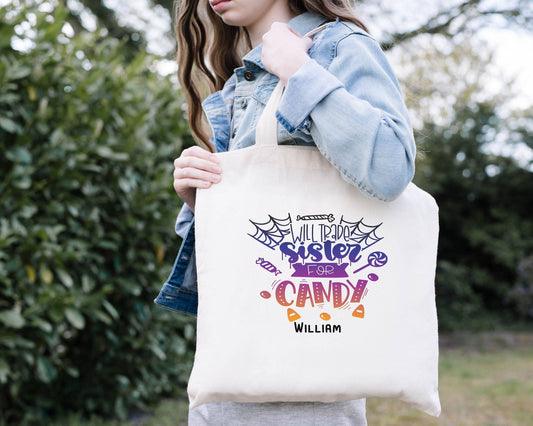 Will Trade Sister For Candy Trick or Treat Bags - Personalized Halloween Bag
